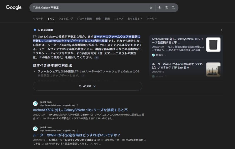 結局、Galaxy側のOSアップデートとTplinkのファームウェアの相性問題であるだろうという推測には辿り着いたものの、一ユーザーとして治せる手立てが見つからず。